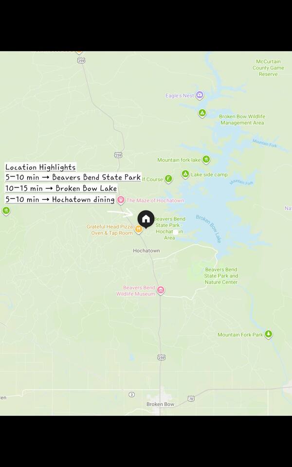 • Peaceful forest setting tucked away in Hochatown • Adventures nearby — zip lining, hiking trails, kayak & rentals • Just 10 minutes to Broken Bow Lake & Beavers Bend State Park • Minutes to local restaurants, wineries, & breweries • Family-friendly fun like mini golf, petting zoos, and go-karts • The perfect mix of nature, comfort, and convenience